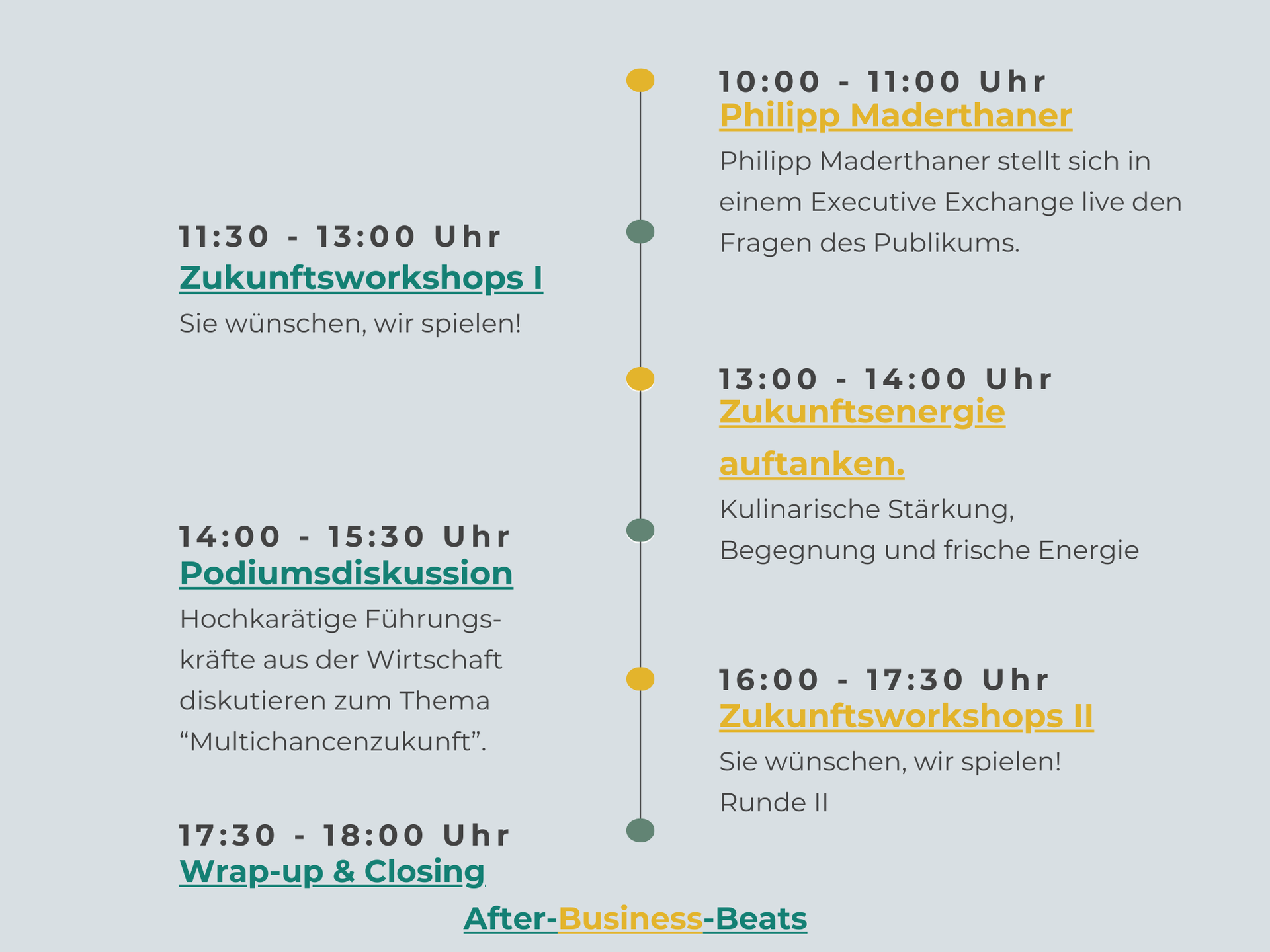 Gestalten Sie Ihr persönliches Zukunftsprogramm. Zwei Workshopslots, jeweils einer am Vormittag und ein Slot am Nachmittag, geben Raum für Ihre individuelle Auswahl.